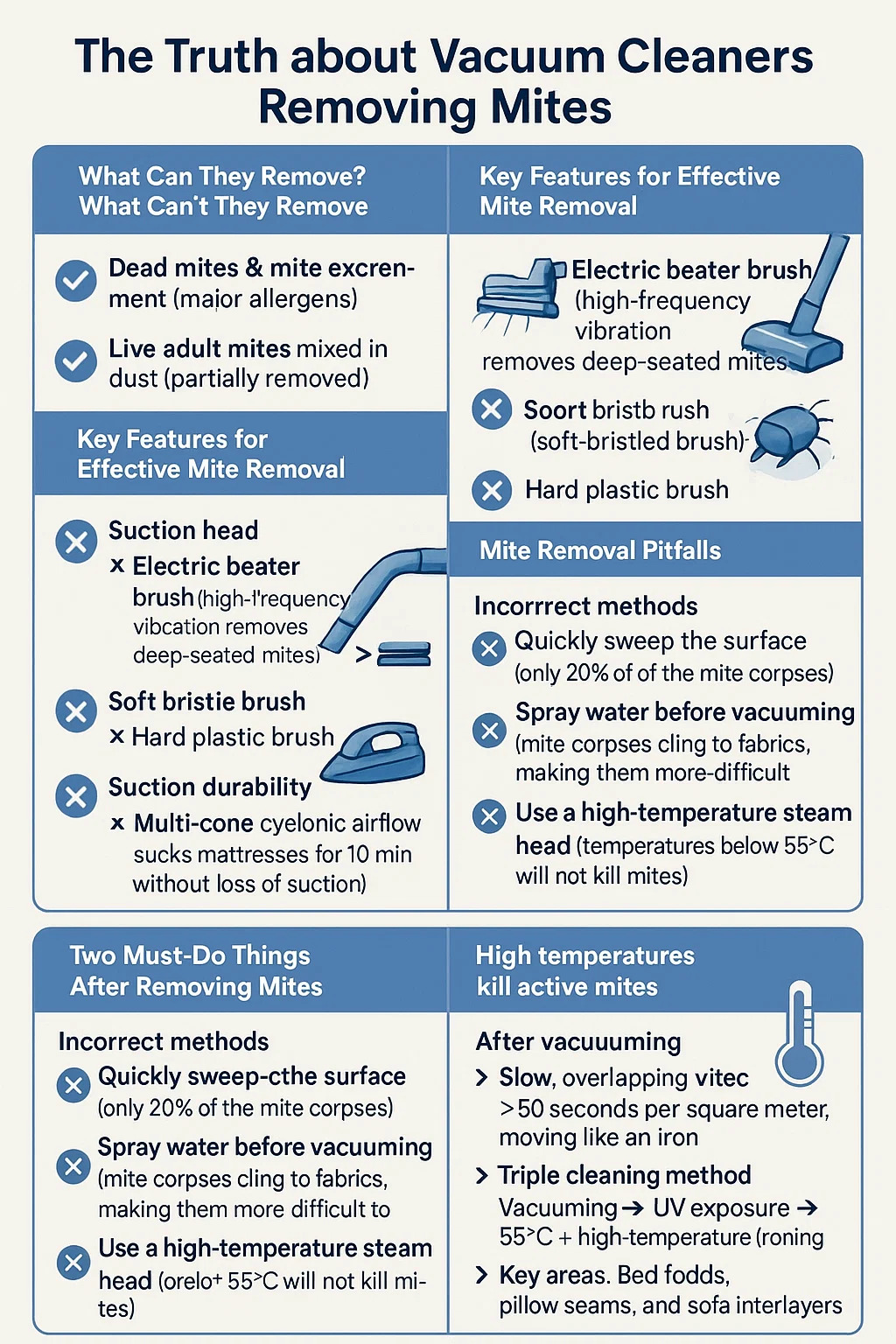 تکنیک صحیح: ► جاروبرقی آهسته و همپوشانی: ≥30 ثانیه در هر متر مربع، حرکت مانند اتو ◄ روش تمیز کردن سه گانه: جاروبرقی → قرار گرفتن در معرض اشعه ماوراء بنفش → اتو با دمای بالا 55 درجه سانتیگراد ◄ مناطق کلیدی: چین های تخت، درزهای بالش، و قسمت های بین لایه های مبل (میته)